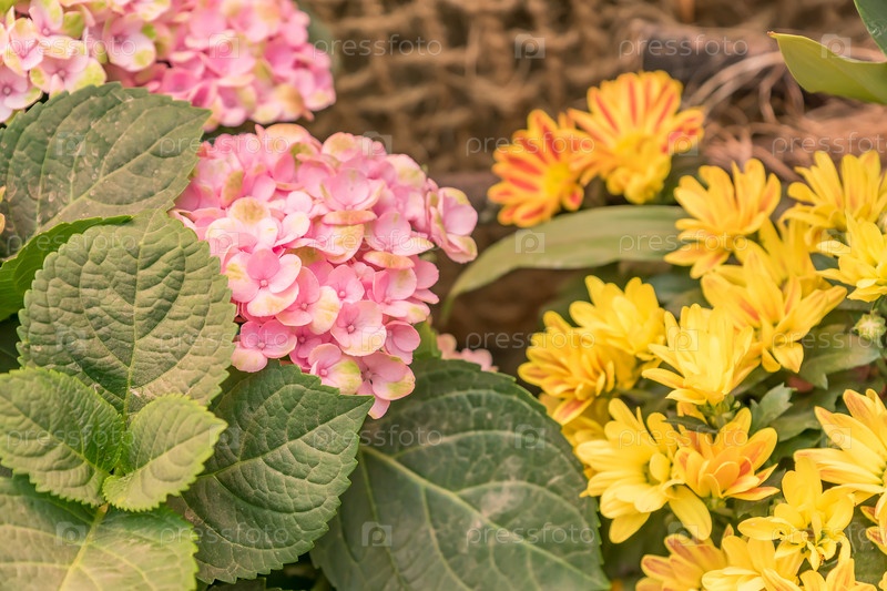 Красивые цветущие розовые цветы гортензии на фоне ажурных шнуров с копией пространства