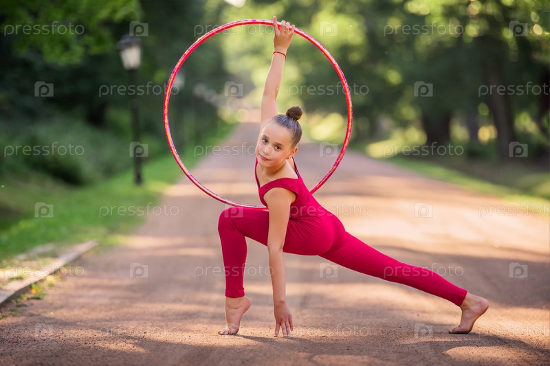 Портрет гимнастки в красном комбинезоне с обручем в парке против