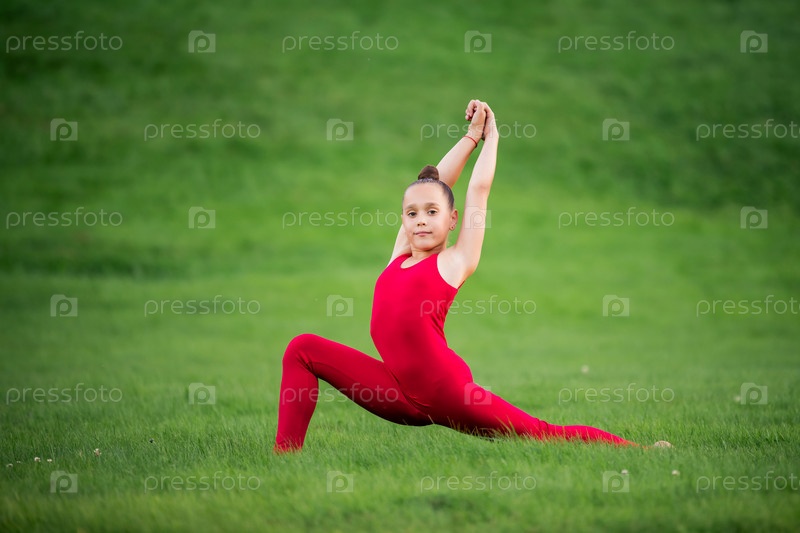 Школьница в ярко-красном комбинезоне занимается гимнастикой на траве в парке, делает упражнения на растяжку