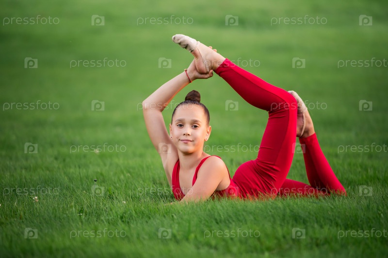 Школьница в ярко-красном комбинезоне занимается гимнастикой на траве в парке, делает упражнения на растяжку
