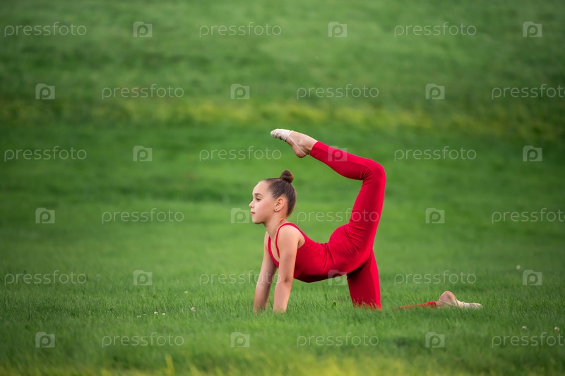 Школьница в ярко-красном комбинезоне занимается гимнастикой на траве в парке, делает упражнения на растяжку