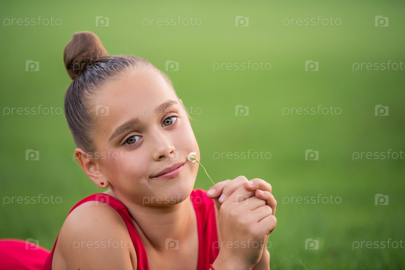 Школьная гимнастка в ярко-красном комбинезоне отдыхает на траве в парке и нюхает цветок клевера. Портрет крупным планом