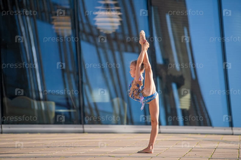 Девушка-гимнастка школьного возраста в красивом кроссовом платье с черным костюмом выполняет упражнение без предмета