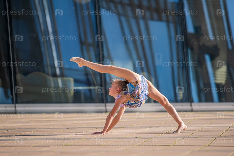Девушка-гимнастка школьного возраста в красивом кроссовом платье с черным костюмом выполняет упражнение без предмета
