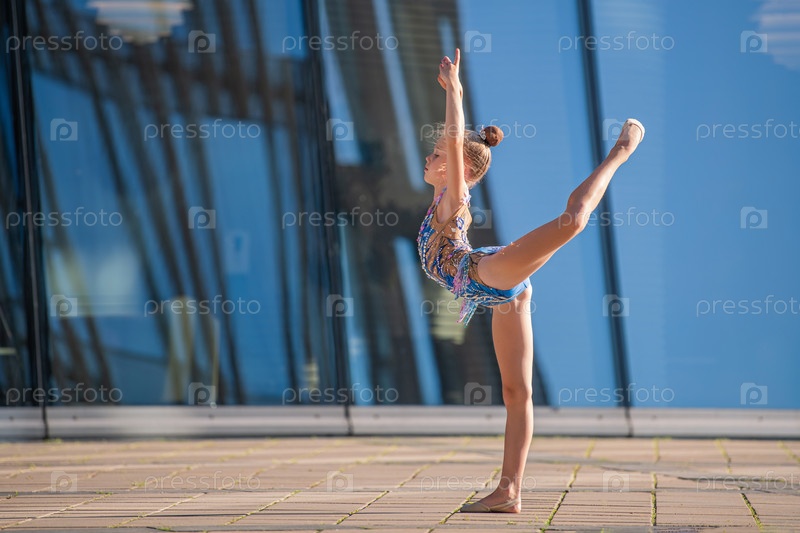 Девушка-гимнастка школьного возраста в красивом кроссовом платье с черным костюмом выполняет упражнение без предмета