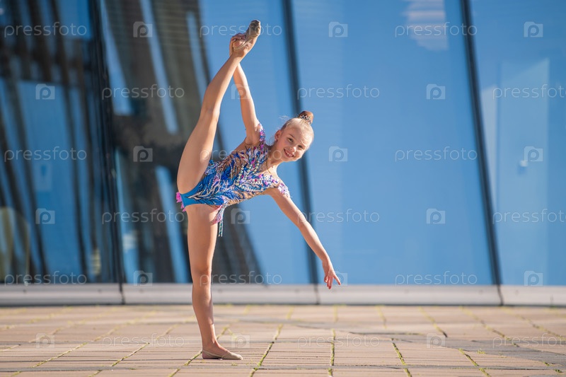 Девушка-гимнастка школьного возраста в красивом кроссовом платье с черным костюмом выполняет упражнение без предмета