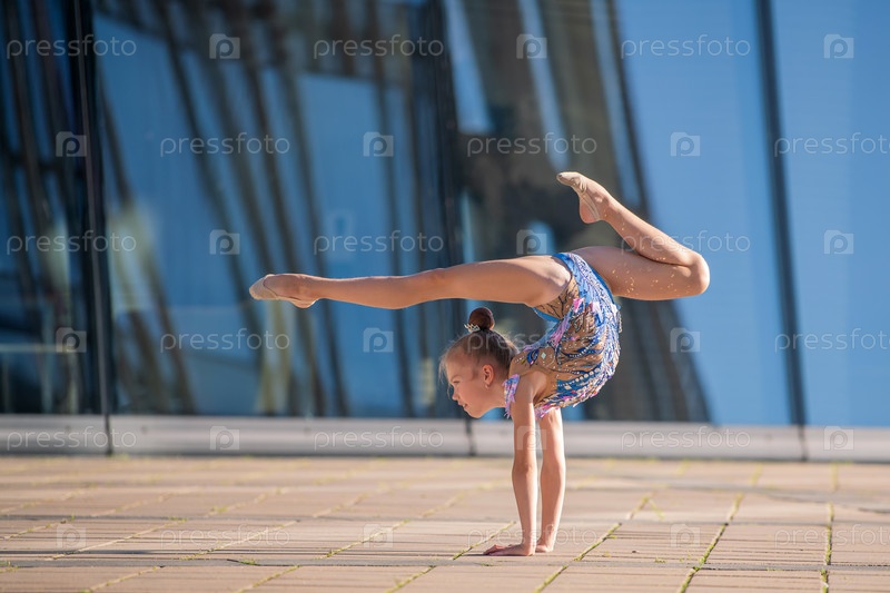 Девушка-гимнастка школьного возраста в красивом кроссовом платье с черным костюмом выполняет упражнение без предмета