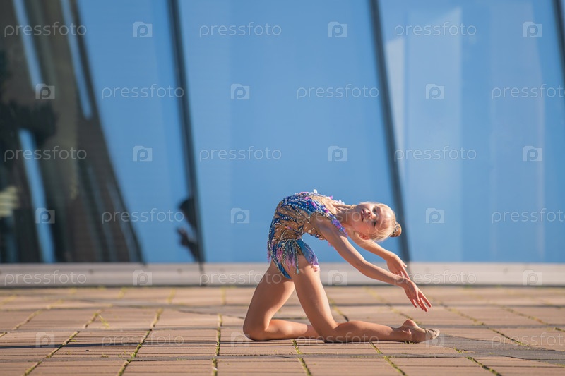 Девушка-гимнастка школьного возраста в красивом кроссовом платье с черным костюмом выполняет упражнение без предмета