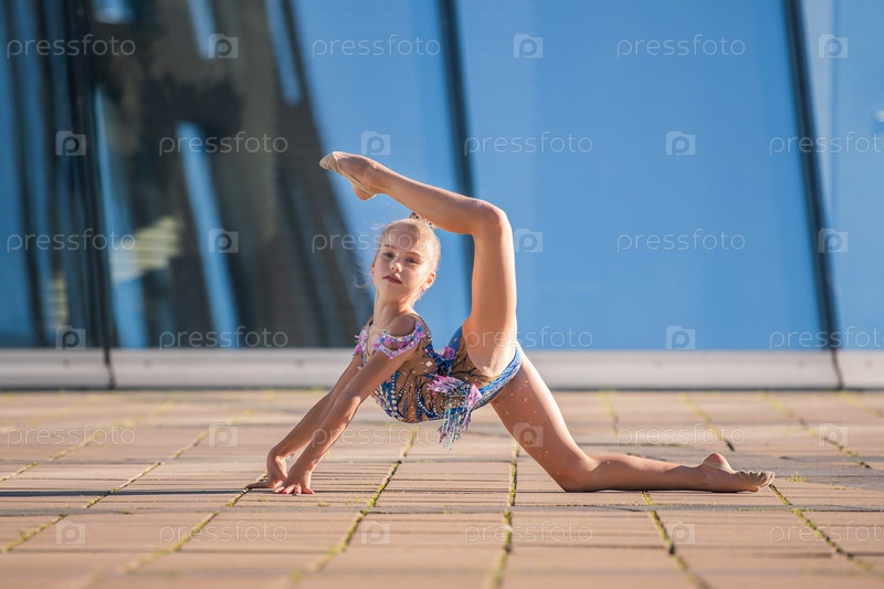 Гимнастка школьного возраста в красивом синем костюме выполняет упражнение без предмета