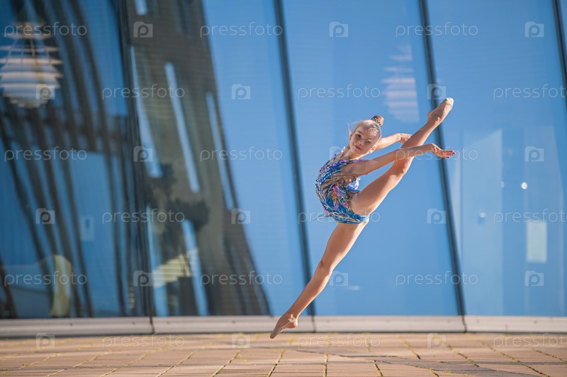 Гимнастка школьного возраста в красивом синем костюме выполняет упражнение без предмета