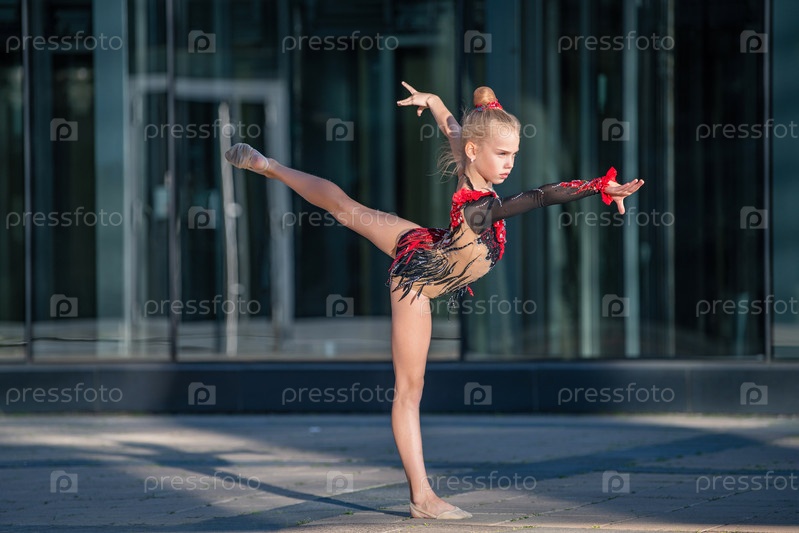 Девушка-гимнастка школьного возраста в красивом кроссовом платье с черным костюмом выполняет упражнение без предмета