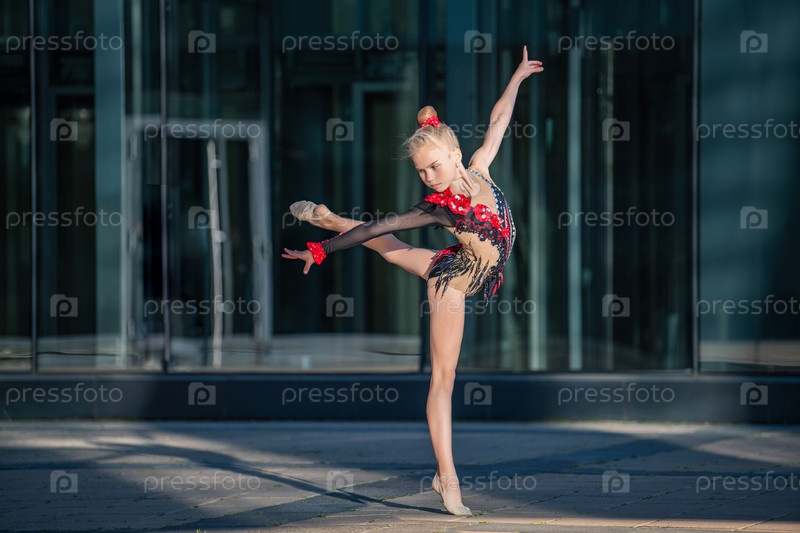 Девушка-гимнастка школьного возраста в красивом кроссовом платье с черным костюмом выполняет упражнение без предмета