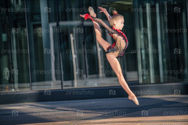 Девушка-гимнастка школьного возраста в красивом кроссовом платье с черным костюмом выполняет упражнение без предмета