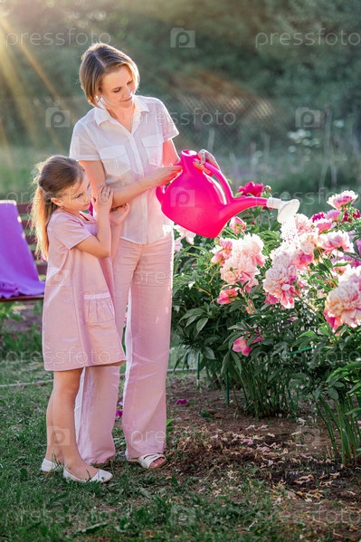 Мама и дочка в льняном розовом платье ухаживают за пионами в саду на даче, поливают цветы. Он прекрасно улыбается и смеется. Озаренный лучами вечернего заходящего солнца