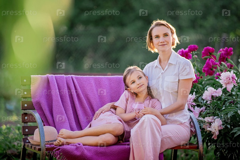 Счастливые семейные отношения. Мама и дочь сидят на скамейке и болтают в саду среди цветов солнечным летним вечером