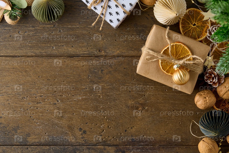 Праздничный рождественский декор с подарками на деревянном фоне. Скопируйте пространство, горизонтальный вид сверху