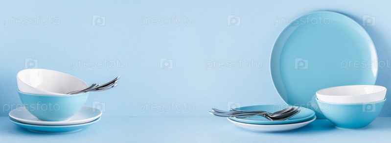 Посуда и столовые приборы на синем пастельном фоне