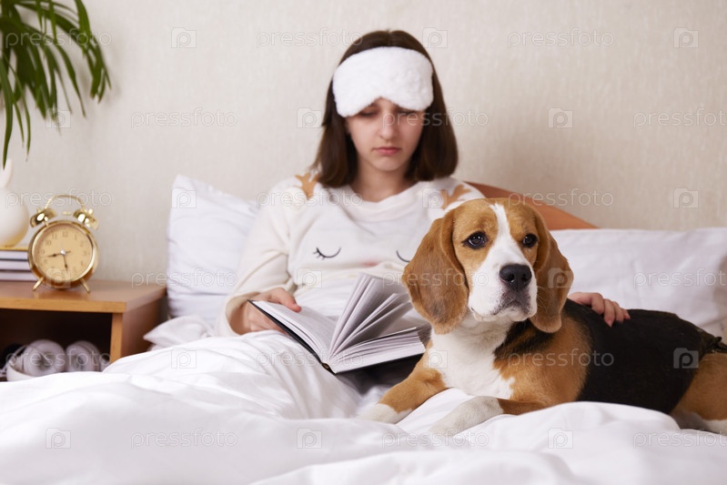 Милая девочка-подросток со своим псом-биглем лежит в постели под одеялом