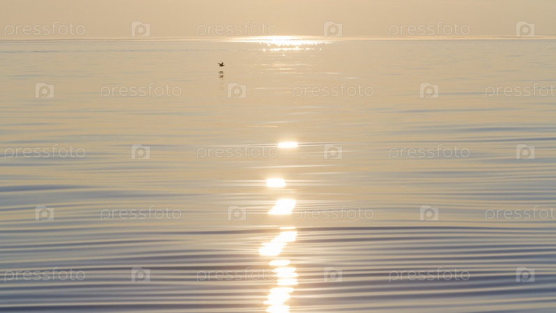 Силуэт чайки над морем на красочном закате