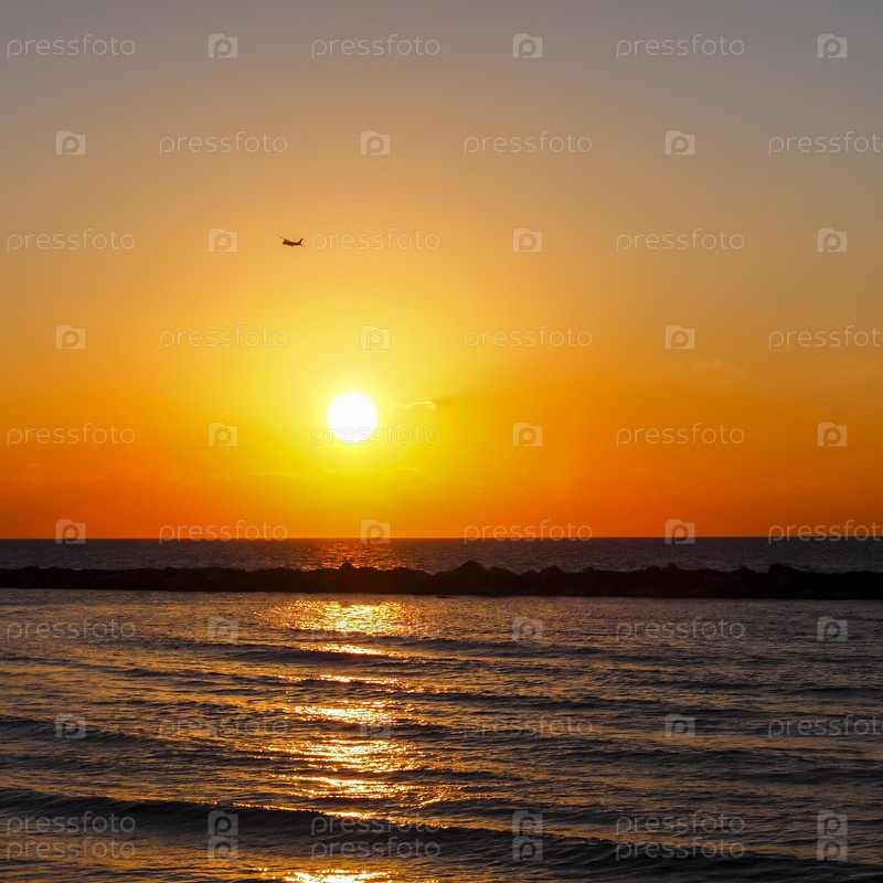 Тихий красивый золотой закат на море. Летний фон природы