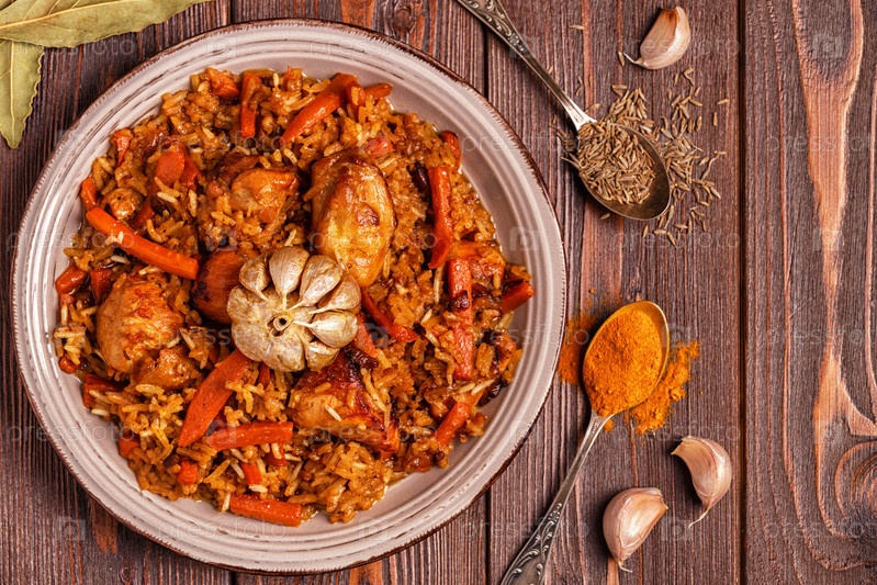 Плов (бирьяни) на деревянном фоне, вид сверху, пространство для копирования