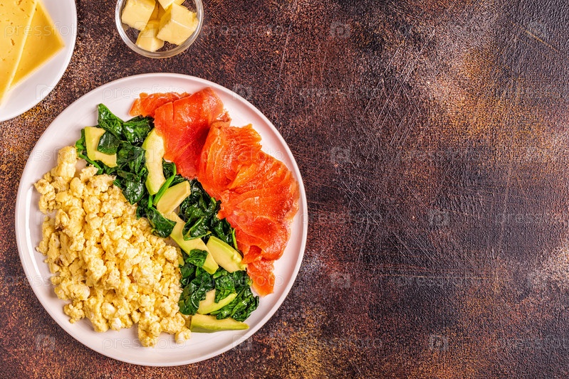 Кетогенный диетический завтрак, яичница, лосось, авокадо, шпинат