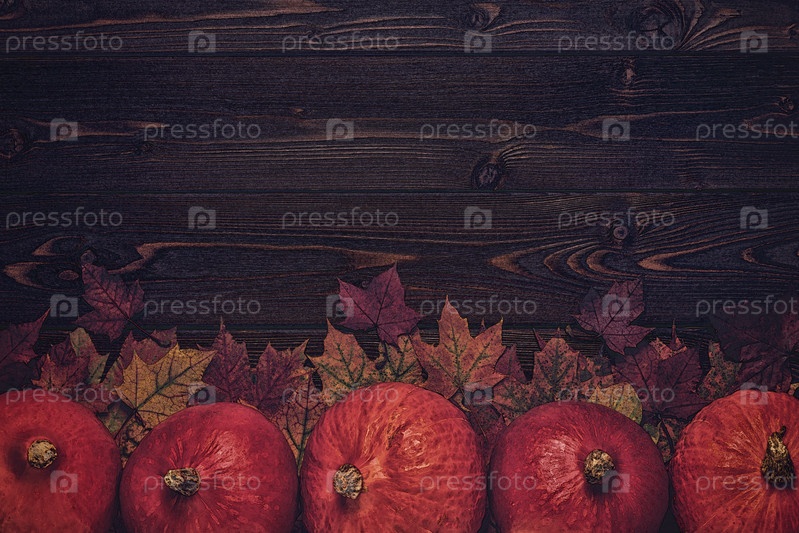 Осенний фон с цветными листьями и тыквами на деревянном фоне