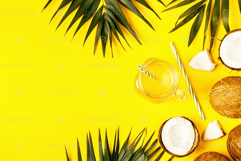Кокосовая вода и кокосы на ярком пастельном фоне