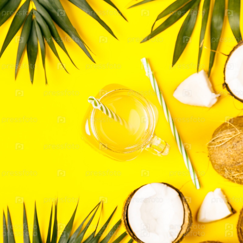 Кокосовая вода и кокосы на ярком пастельном фоне
