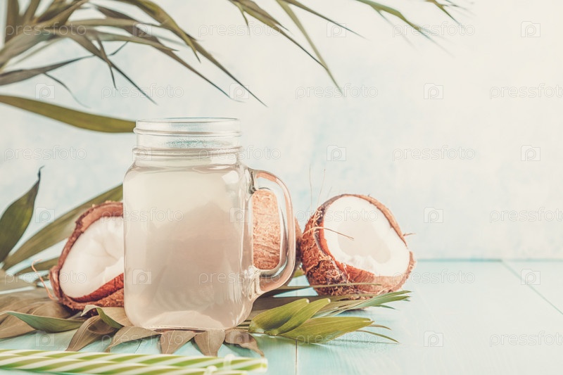 Кокосовая вода и кокосы на ярком пастельном фоне