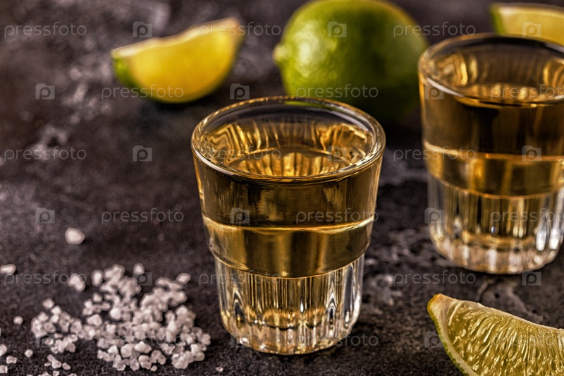 Текила в рюмках с лаймом и солью