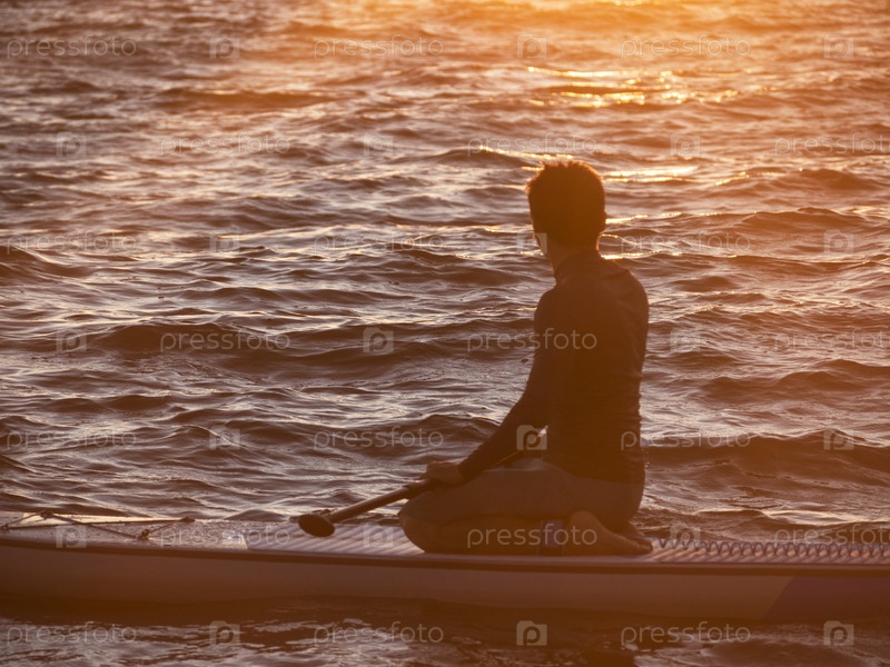 Человек сидит и отдыхает на SUP в солнечном свете на фоне заката и моря