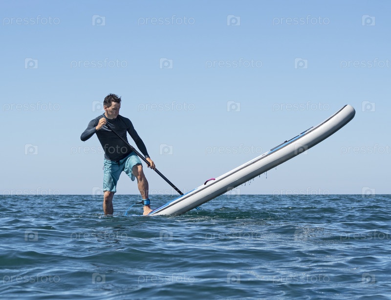 Молодой активный мужчина делает поворот или делает шаг назад, поворачивая трюк на доске для весла