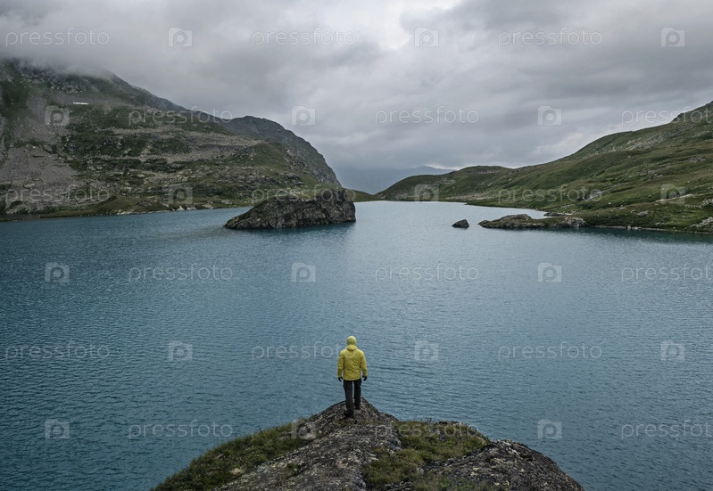 Человек, стоящий на скале на фоне голубого озера в пасмурный дождливый день