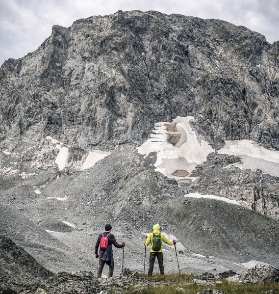 Двое активных мужчин с рюкзаками и треккинговыми палками гуляют по скалистым горам