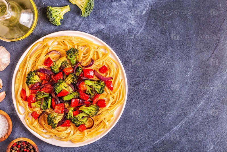 Паста с брокколи, перцем, луком