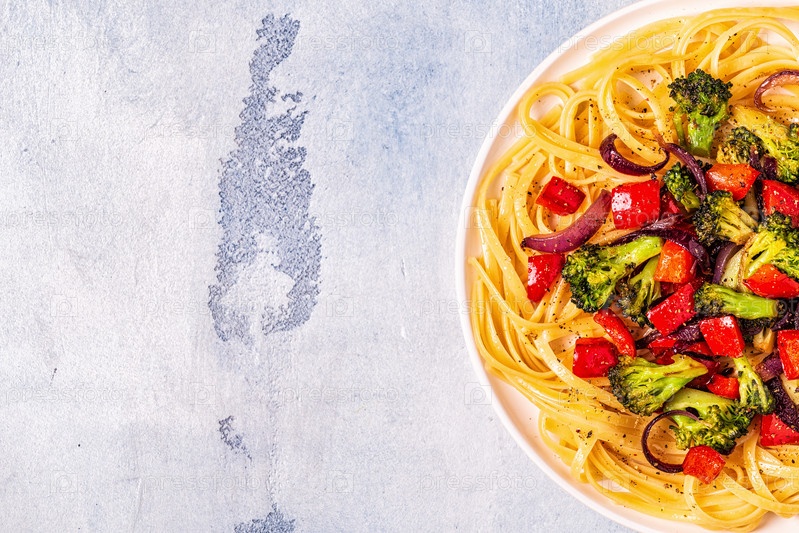 Паста с брокколи, перцем, луком