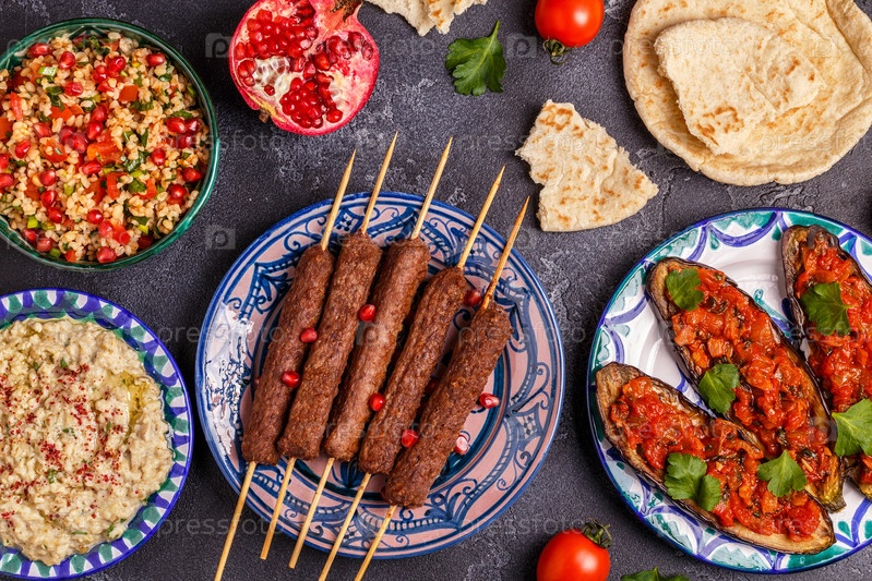 Классический шашлык, салат табуле, баба гануш и запеченные баклажаны с соусом