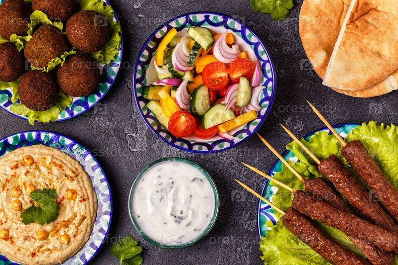 Классические шашлыки, фалафель и хумус на тарелках