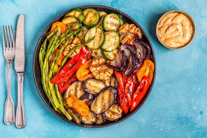 Жареные овощи на тарелке с соусом
