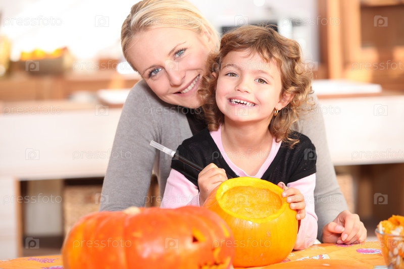 Мать и дочь вырезают тыквы