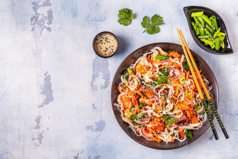 Азиатский салат с рисовой лапшой, креветками и овощами