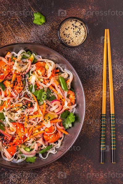 Азиатский салат с рисовой лапшой, креветками и овощами