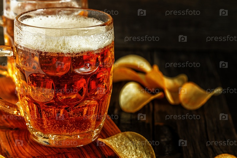 Холодное пиво в стакане с чипсами на темном фоне
