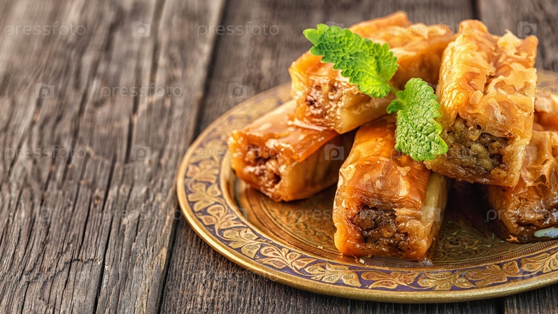 Традиционный арабский десерт пахлава с медом и грецкими орехами