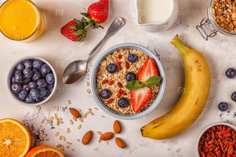 Здоровый завтрак - чаша овсянки, ягод и фруктов