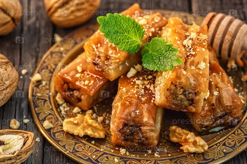 Традиционный арабский десерт пахлава с медом и грецкими орехами