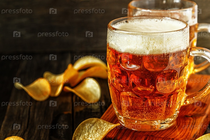 Холодное пиво в стакане с чипсами на темном фоне