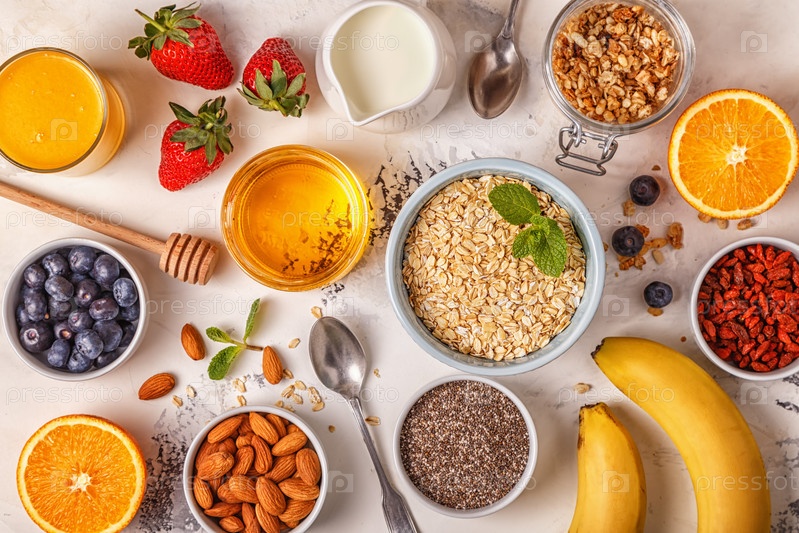 Ингредиенты для здорового завтрака - овсянка, мюсли, мед,