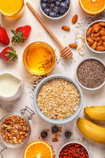 Ингредиенты для здорового завтрака - овсянка, мюсли, мед, орехи, ягоды, фрукты